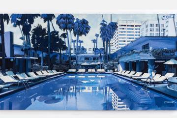 Normally when making a show, it falls under this criteria, what am I trying to say and portray. More often than not, it is about depicting the fading fabric of our urban environments. Whether it is the high street closing down or losing its spark, with record stores, laundrettes, newsstands (and print) or pubs closing but on top of that, I always try thinking how to push my technique, how to make out of denim something like a shiny floor, a polished bar surface and in the last years, how to depict water, just with jeans, no bleach, paint, dyes, etc. While the former was less of an influence, I had been over in L.A. and I just wanted to bring that Californian light into my London winter studio as well as bring a bit more happiness, so I changed a little, making the different hotel pools I had stayed in. I’d gone quite dark with the previous body of work so wanted to bring more light into the work for a while.