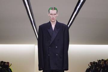 Categorically, trousers were the starting point. They were cut, panelled and layered, like an extra appendage, flapping under oversized coats and jackets. A bomber and leather jacket worn three sizes up had a familiar thrift shop allure, with fabric the point of elevation. Demna’s East European tropes are engrained in his silhouette, they are as much a legacy to him as the skinny cut is to Hedi Slimane.