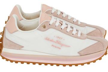 The sneaker features a slim silhouette and bright colours, and uses fabric elements alongside suede and smooth leather. Among the versions is one with the iconic Ferragamo rainbow and one with an all-over Gancini pattern.
