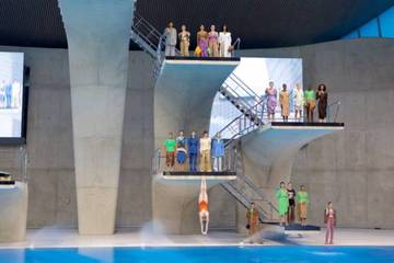 Set in the London Aquatic Centre, Rejina Pyo’s show opened with a diving presentation from Team GB Olympic divers followed by a bold collection of effortlessly casual daywear.