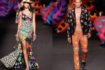 Models sporting bra tops teamed with flared embroidered trousers or psychedelic printed pantsuits accessorized with beaded chains, shared the catwalk with boys in leopard skin and India-esque printed Speedos worn with matching bombers. It proved to be a celebration of explosive coloring and flower power, a steady stream of 60s references from Moschino's Creative Director Jeremy Scott, who's collections have an unabashed flock of celebrity followers and loyal fashionistas.