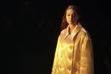 These material and structural juxtapositions carried an integral role in the collection, with an emphasis on conflicting layers and textural exploration. Model Gigi Hadid opened the show in an ivory, satin coat with dramatic padding, a silhouette that became a regular occurrence throughout and contrasted sharply with form-fitting, silk harnesses. This relaxed outerwear was further illustrated through enveloping trenches and leather moto jackets, each offering additional innovative shaping.