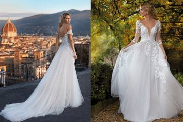 The new collection reinvents long lace sleeves and the most romantic off shoulders necklines, wide and dramatic skirts shine with glitter embroidery and waves of tulle powder. The printed organza illuminates the most feminine silhouettes and the black & white contrasts and pleated skirts define the trends of the bridal style.